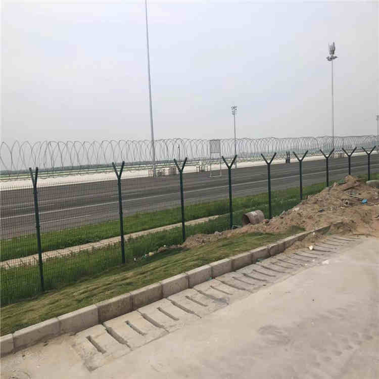 工程案例 機(jī)場護(hù)欄網(wǎng)又稱作“Y型安全防御護(hù)網(wǎng)”,是由V型支架立柱,加強(qiáng)型焊接片網(wǎng),安全防盜連接件和熱鍍鋅刀片刺籠組成強(qiáng)度和安全防御性級(jí)別很高。近年來,被廣泛應(yīng)用在機(jī)場,軍事基地等高安全場所。