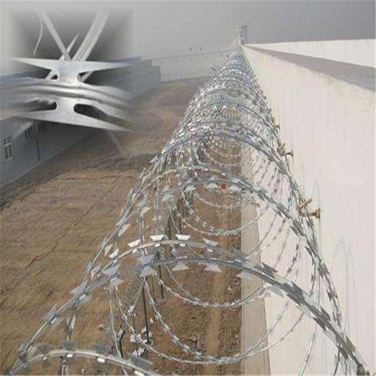 新聞動(dòng)態(tài)監(jiān)獄專門用來(lái)防護(hù)的鐵絲網(wǎng)學(xué)名叫做鍍鋅刀片刺繩,可以直接安裝在墻面上,也可以在墻面安裝圍欄網(wǎng)以后再圍欄網(wǎng)上邊安裝。