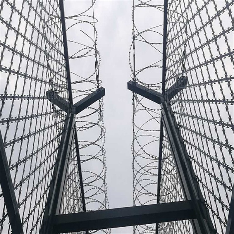 刀刺隔離網(wǎng)的安裝: 1.將拉線展開拉直固定在立柱頂部的V形支架上,由于需要安裝的刀片刺絲有許多鋒利的尖刺,注意采取防護措施,以免傷到施工人員。2.刀片刺絲(直徑600mm)打開包裝,首先將一端固定在支架上后,按照螺旋順序展開,均勻分布間距控制在10圈/m,刀片刺 絲與刺繩的交點處用綁線捆扎固定。3.檢查各連接部位是否連接牢固4.驗收