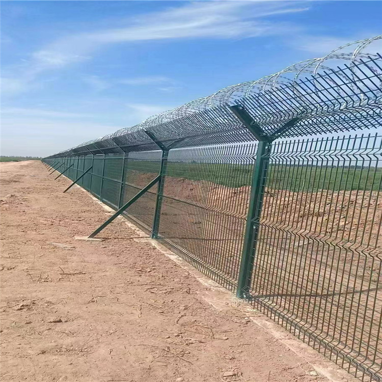 機場圍網(wǎng)、機場圍界、機場護欄網(wǎng)又叫機場鋼筋網(wǎng)圍界,是由V型支架立柱和加強型焊接片網(wǎng),安全防盜連接件和熱鍍鋅刀片刺網(wǎng)組成。機場圍網(wǎng) 機場圍界 機場護欄網(wǎng)頂部加裝刺絲滾籠,后又很好的增強了安全防護性能。采用電鍍、熱鍍、噴塑、浸塑等防腐形式,具有很好的抗老化、抗曬、耐腐蝕等特點。其產(chǎn)品造型美觀、花色多樣,既起到圍欄作用,又起到美化作用。由于具有安全性高、防攀爬能力好,網(wǎng)片連接方式采用特制SBS緊扣件,有效防止人為的破壞性拆卸,橫向四道折彎加強筋,使網(wǎng)面強度顯著增加。
