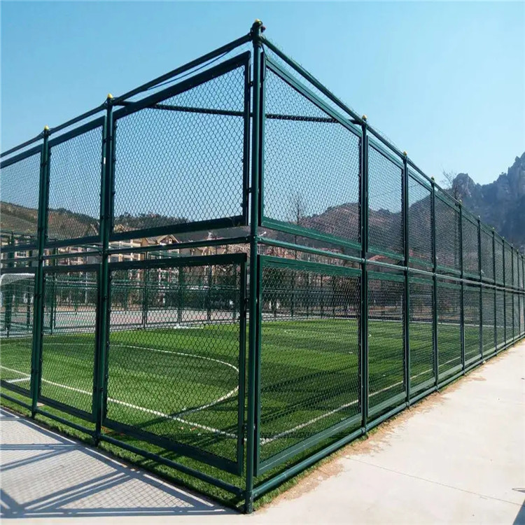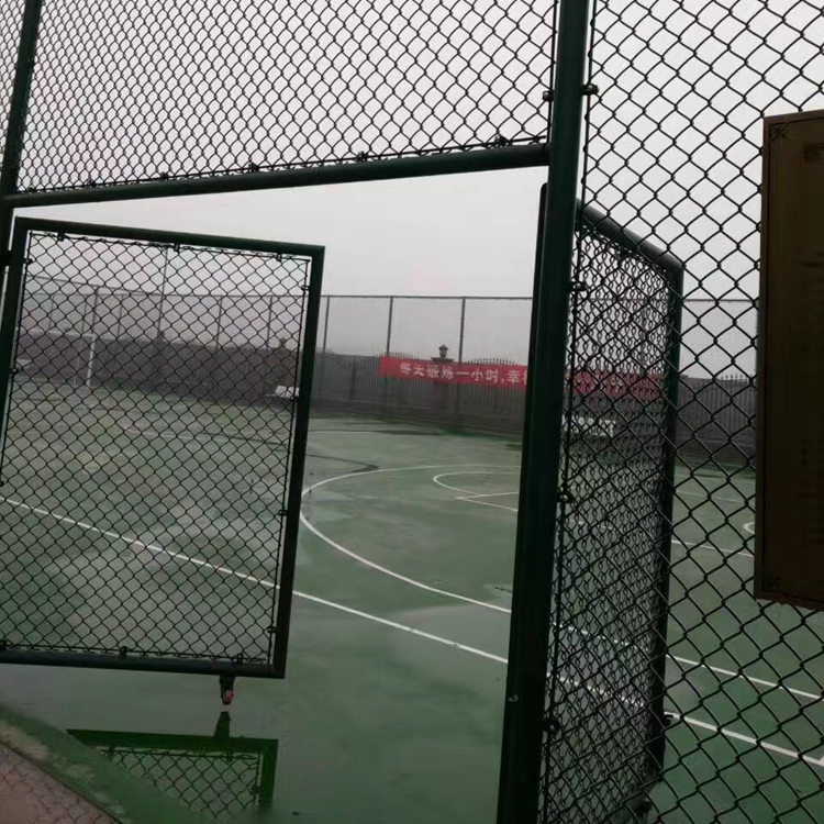 圍網(wǎng)采用套塑圍,顏色為墨綠色,圍網(wǎng)高度為4米,網(wǎng)眼尺 寸為45mm×45mm,網(wǎng)線徑為3.6mm。圍網(wǎng)立柱上、下橫桿采用國標焊管制安,立柱高度為4米,φ75mm圓管,上、下橫桿為φ60mm圓管,球場入門由φ60mm圓管焊接制成。
