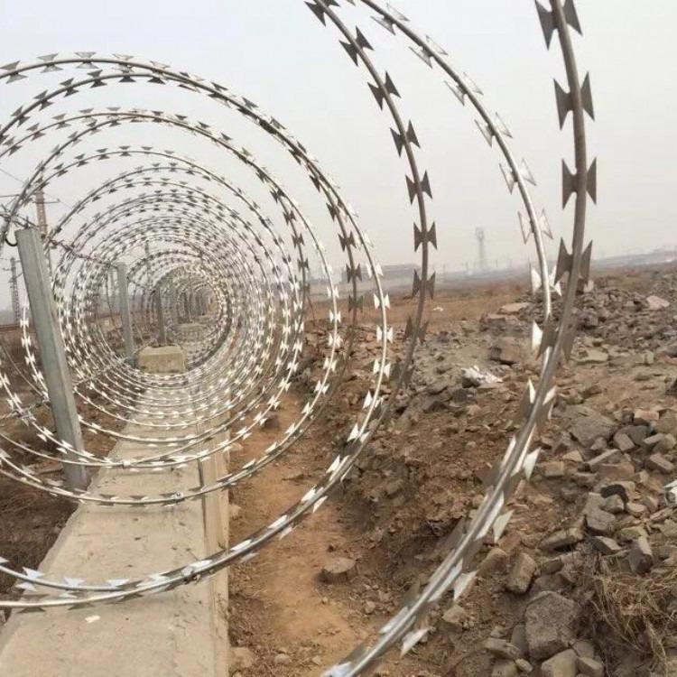 刺絲滾籠結(jié)構(gòu):熱鍍鋅板和鋼絲由銳利尖角鍍鋅鋼板或不銹鋼薄板做刀片,高張力鋼絲做芯線組合而成的阻絕器材。由于刺網(wǎng)造形獨(dú)特不易觸摸,因而能達(dá)到極好的防護(hù)隔離效果。