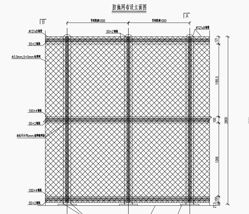 3.防批網(wǎng)網(wǎng)片應選用冷拔低碳鋼絲制作,網(wǎng)絲直徑3mm,網(wǎng)孔5x5mm